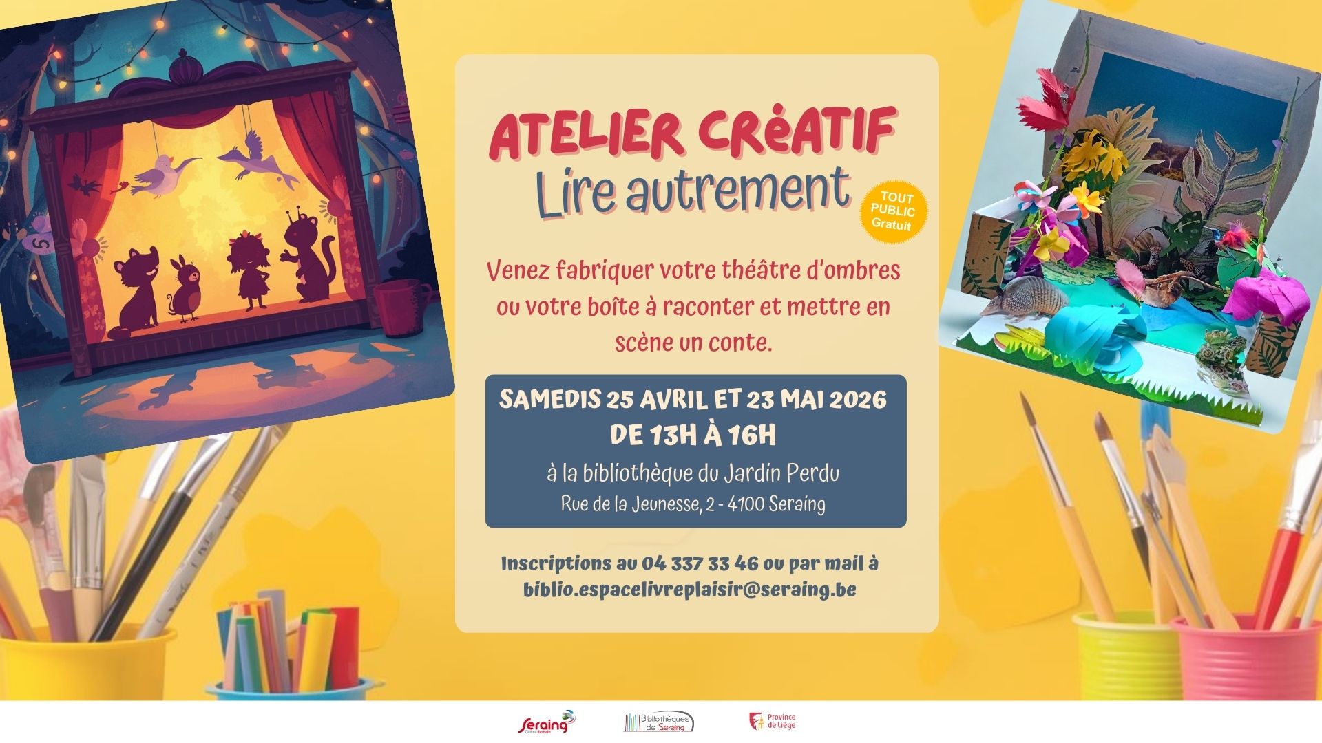 Bibliothèque du Jardin Perdu rue de la Jeunesse 2, Seraing, Liège, BelgiqueLes bibliothèques de la Ville de Seraing vous invite à un atelier créatif basé sur la lecture. Venez fabriquer votre théâtre d’ombres ou votre boite à raconter et mettre en […]