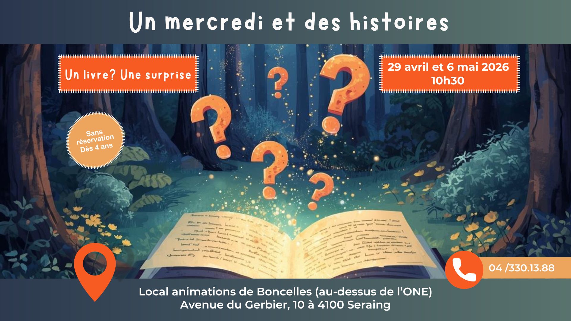 Local animation de Boncelles avenue du Gerbier, 10, Seraing, BelgiqueParticipez à la prochaine séance de lecture « Un mercredi et des histoires » sur le thème « Un livre? Une surprise ». Un événement gratuit, sans réservation et accessible dès l’âge de 4 […]